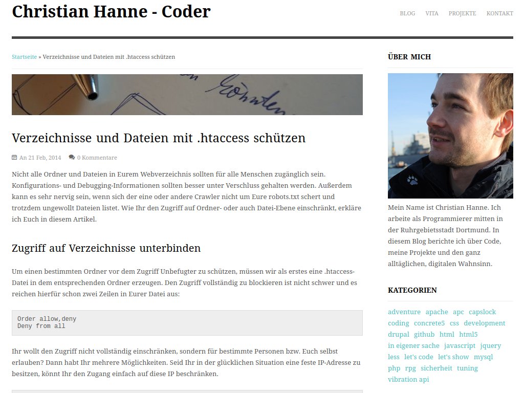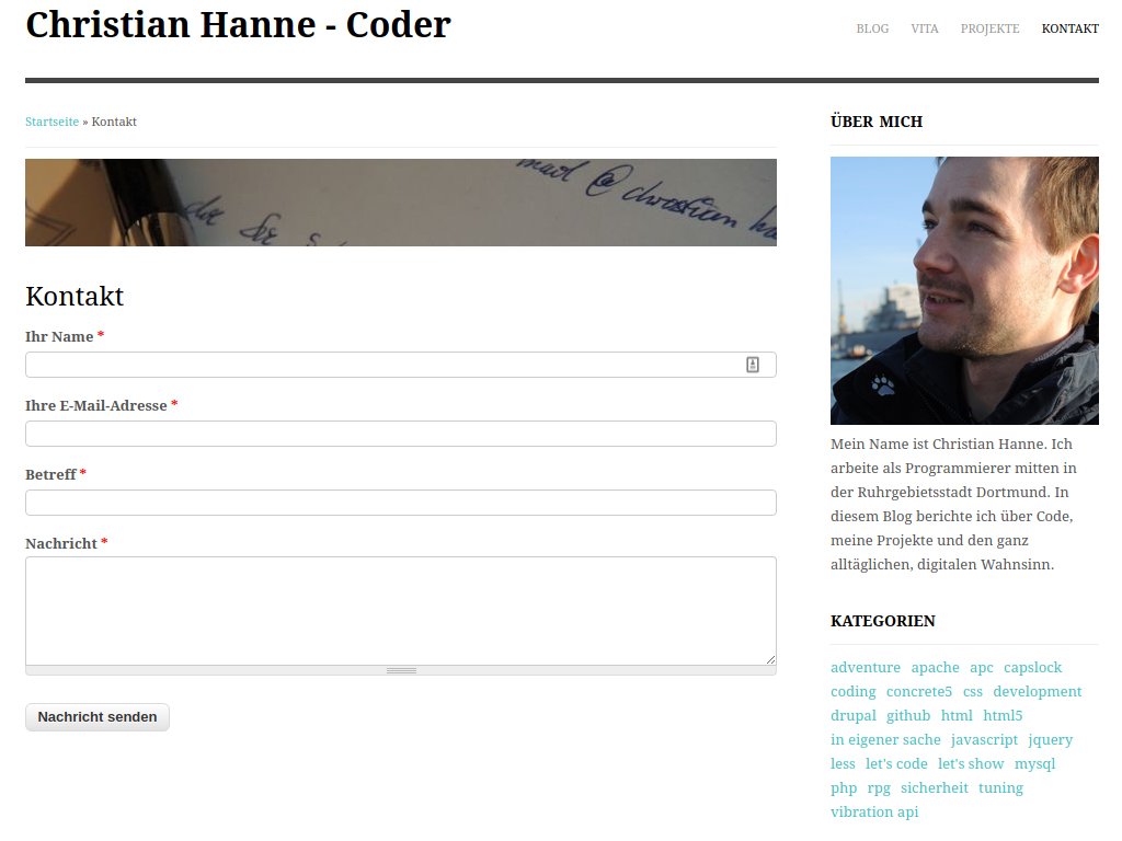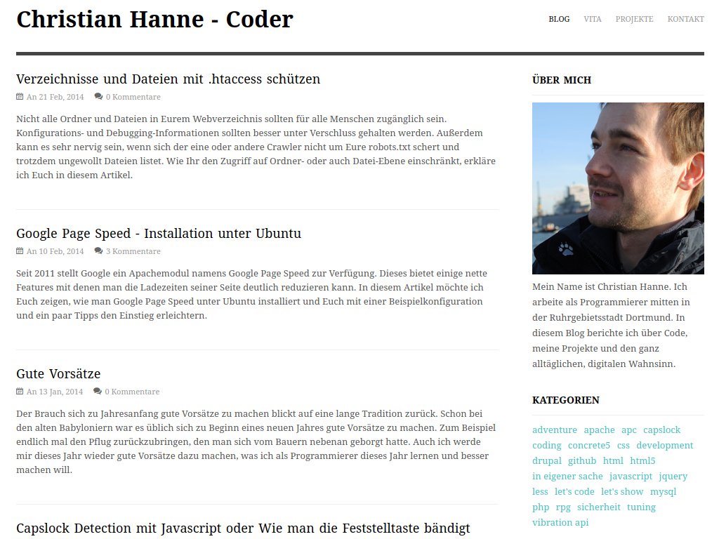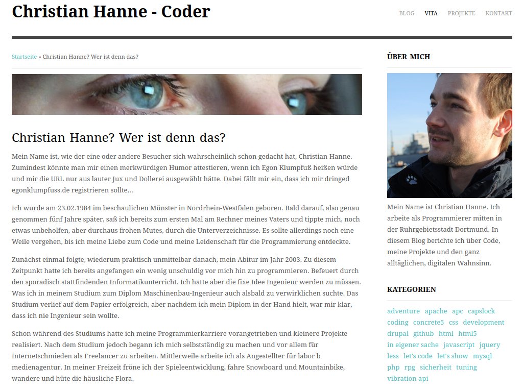 Corona Codes ging damals natürlich vom Netz. Allerdings wollte ich trotzdem weiterhin die Möglichkeit haben über meine Arbeit zu schreiben. Anfang des Jahres 2012 nutzte ich darum meine neu erworbenen Drupal-Fähigkeiten und stellte meinen ersten Blog online. Diesmal verzichtete ich auf tiefgründige Namensgebungen und nutzte statt dessen einfach meinen eigenen Namen.