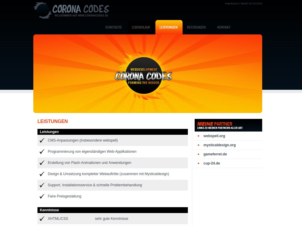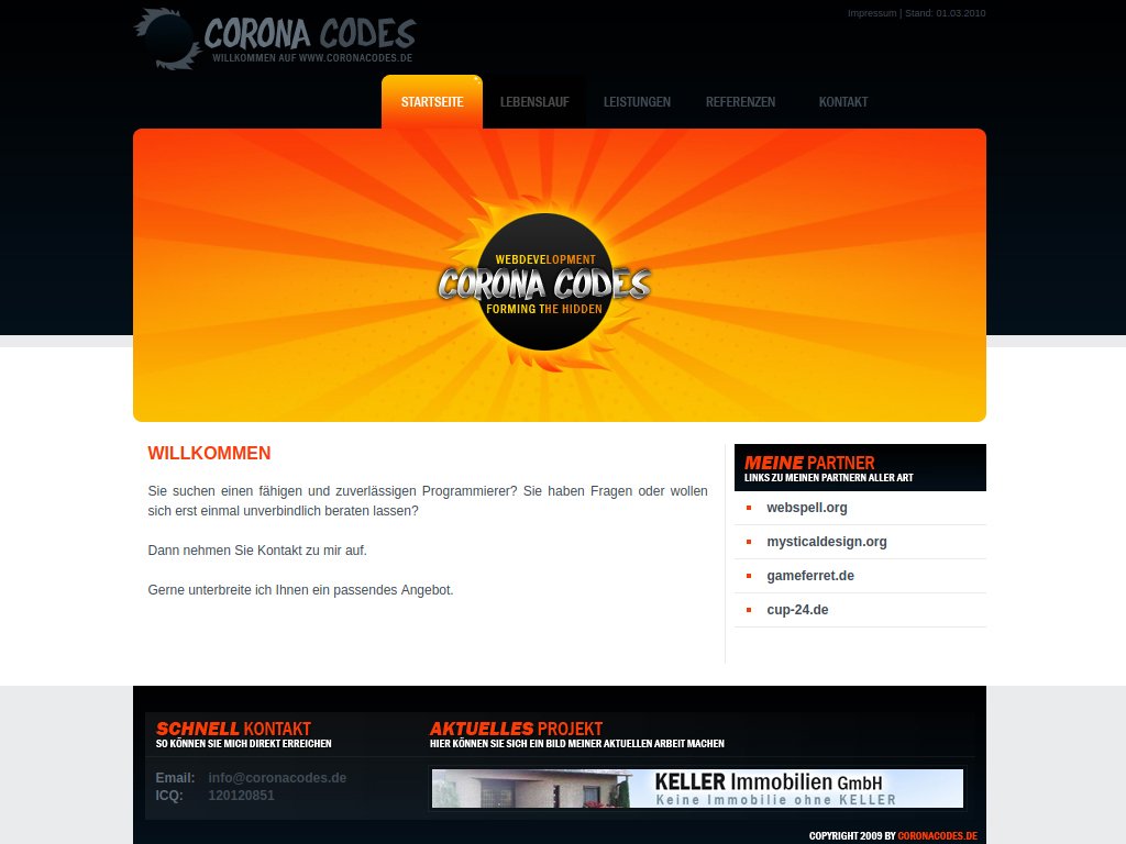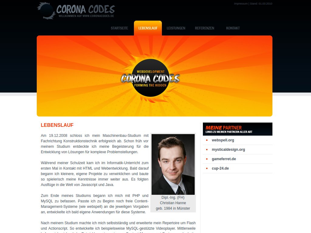 Neben dem Studium hatte ich bereits begonnen mich mit Programmierung zu beschäftigen. Nach dem Studium setzte ich also alles auf eine Karte und hängte mein Diplom an den Nagel. Ich wurde Freelancer. Zu Gute kam mir, dass mein Bruder bereits als Webdesigner arbeitete. So konnte ich an die ersten Aufträge kommen, indem ich ihn als Entwickler unterstützte. Allerdings brauchte ich noch einen Namen für meine Unternehmung. Ich entschied mich für Corona Codes.