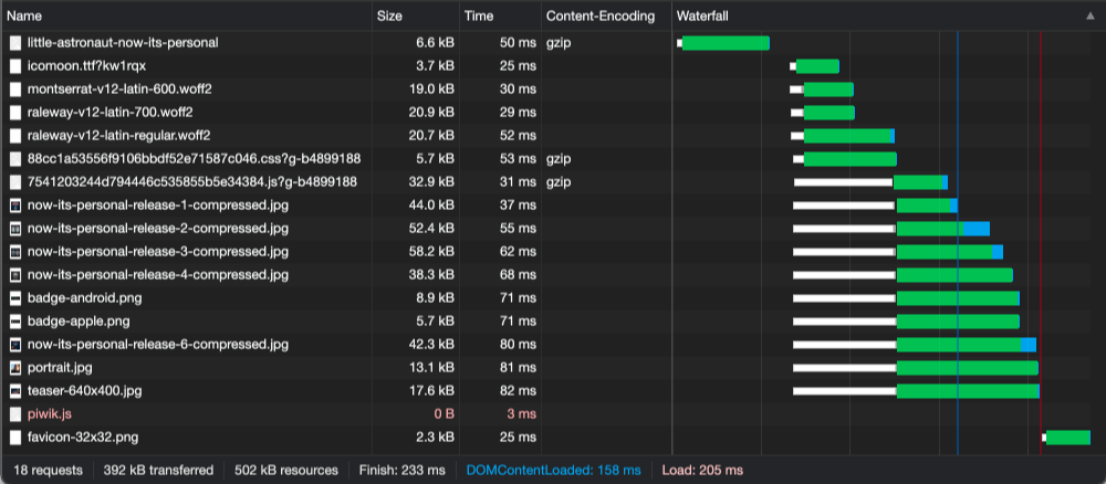 While the article Little Astronaut - Now It's Personal previously loaded in 324ms and covered 984kb, it now loads in 233ms and covers only 392kb. So the response time was reduced by 28%, and the size by a whole 60%.