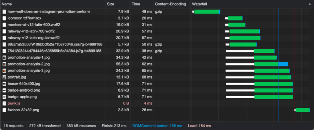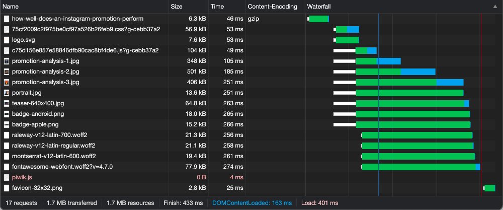 The article How well does an Instagram promotion perform? was initially loaded in 433ms and the download size was 1.7mb. Now it loads in 213ms and is only 272kb. Here, the time is reduced by almost 50% and the download size drops by more than 80%.