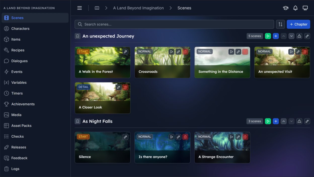 The editor is visual and no code. You build scenes, choices, and outcomes by arranging story pieces instead of writing scripts.