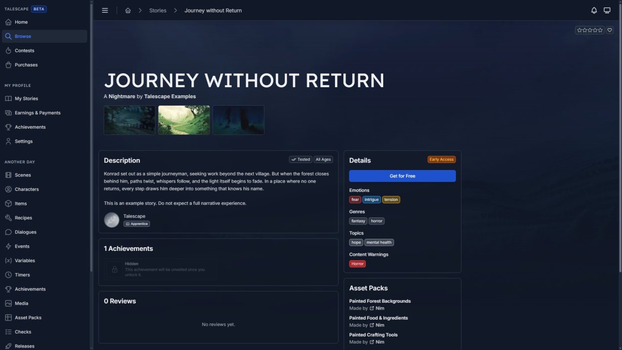 Talescape is an interactive storytelling platform where you can play stories and create your own. Every story is written and shaped by human creators, with player choice at the center of the experience.